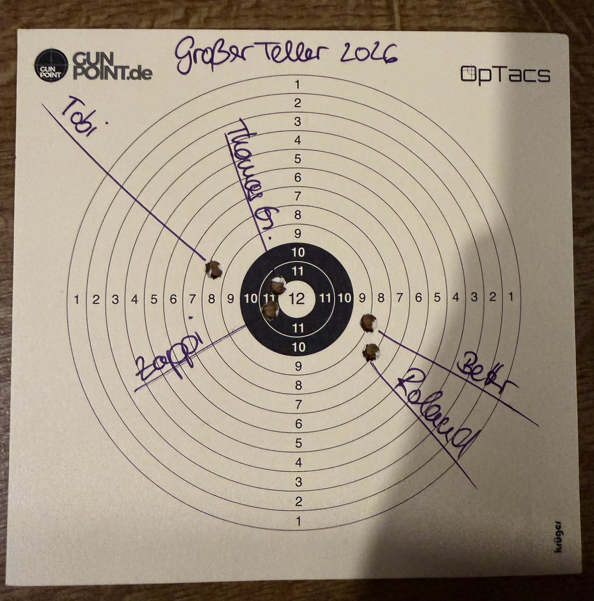 Doch nun zu unseren offiziellen Wettbewerben. Wie üblich starteten wir mir dem „großen Teller“. Hierbei schoss jeder Schütze fünf Mal auf die Scheibe. Hierbei erreichten Thilo, Thomas Z und Thomas B. das Finale. Hierbei konnte sich Thilo knapp durchsetzen. Thomas Z konnte sich den zweiten Platz sichern.